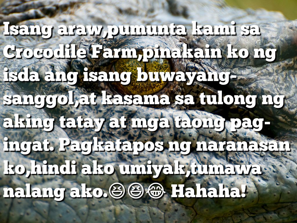 Isang araw,pumunta kami sa Crocodile Farm,pinakain ko ng isda ang isang buwayang-sanggol,at kasama sa tulong ng aking tatay at mga taong pag-ingat. Pagkatapos ng naranasan ko,hindi ako umiyak,tumawa nalang ako.😆😆😂 Hahaha!