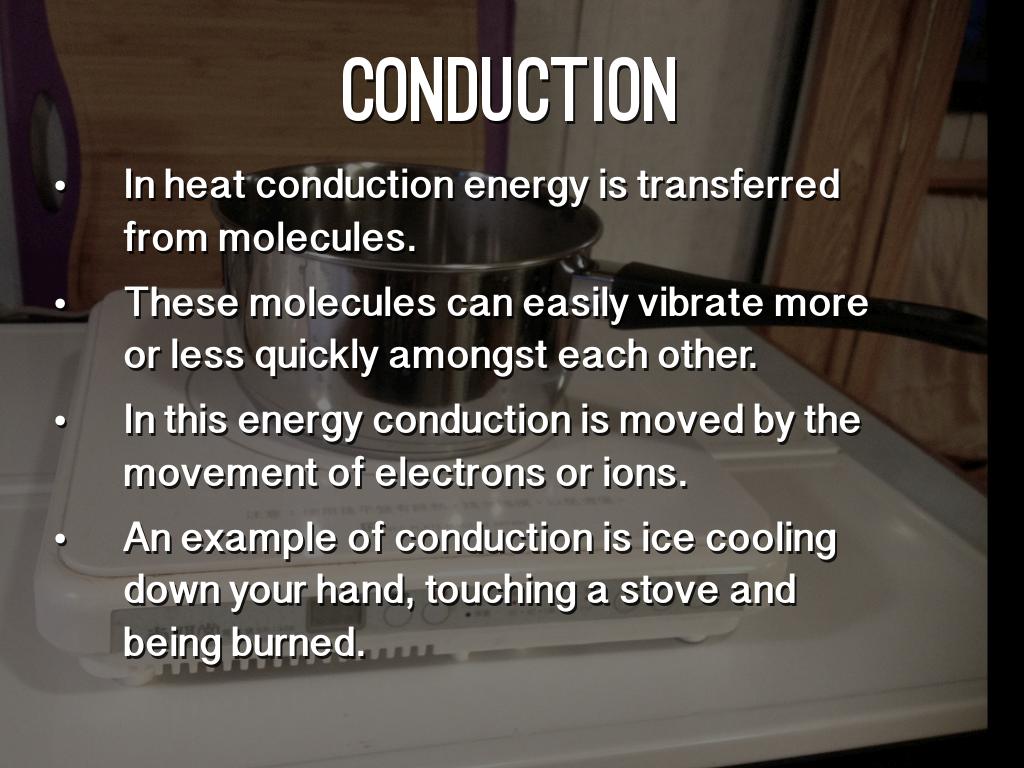 • An example of conduction is ice cooling down your hand, touching a stove and being burned.