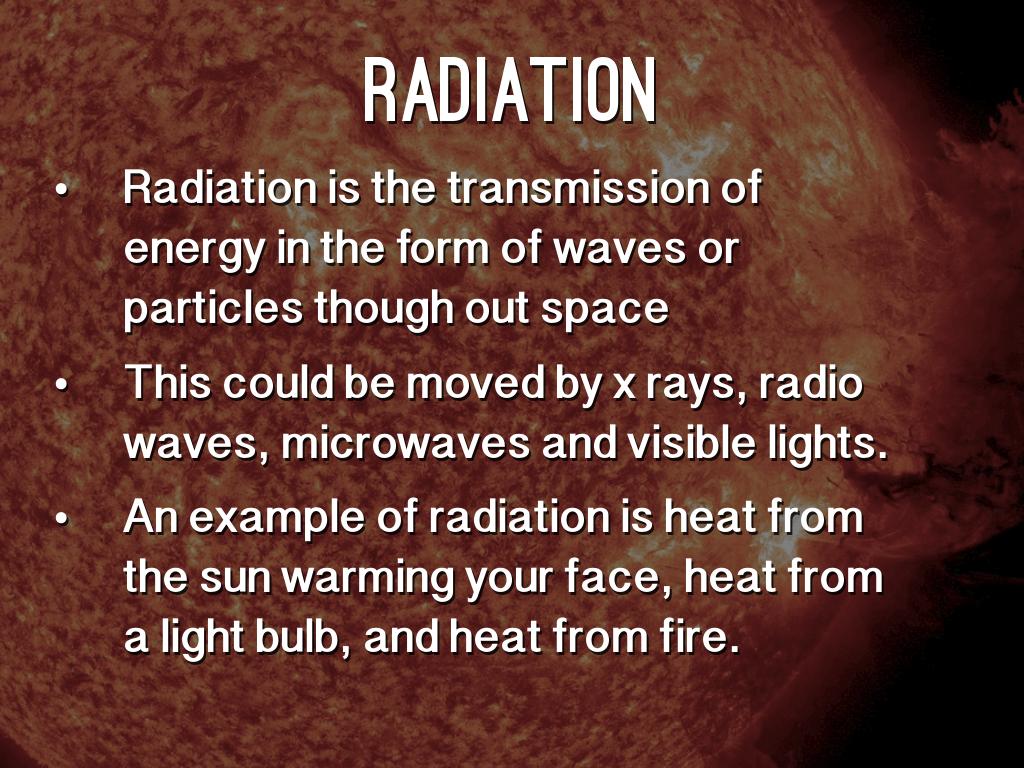 • Radiation is the transmission of energy in the form of waves or particles though out space