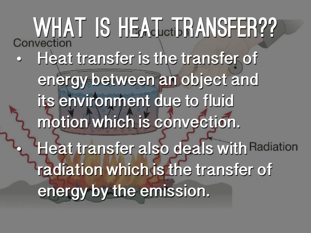 • Heat transfer is the transfer of energy between an object and its environment due to fluid motion which is convection.