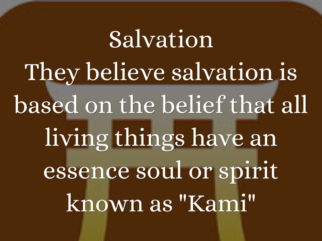 They believe salvation is based on the belief that all living things have an essence soul or spirit known as "Kami"