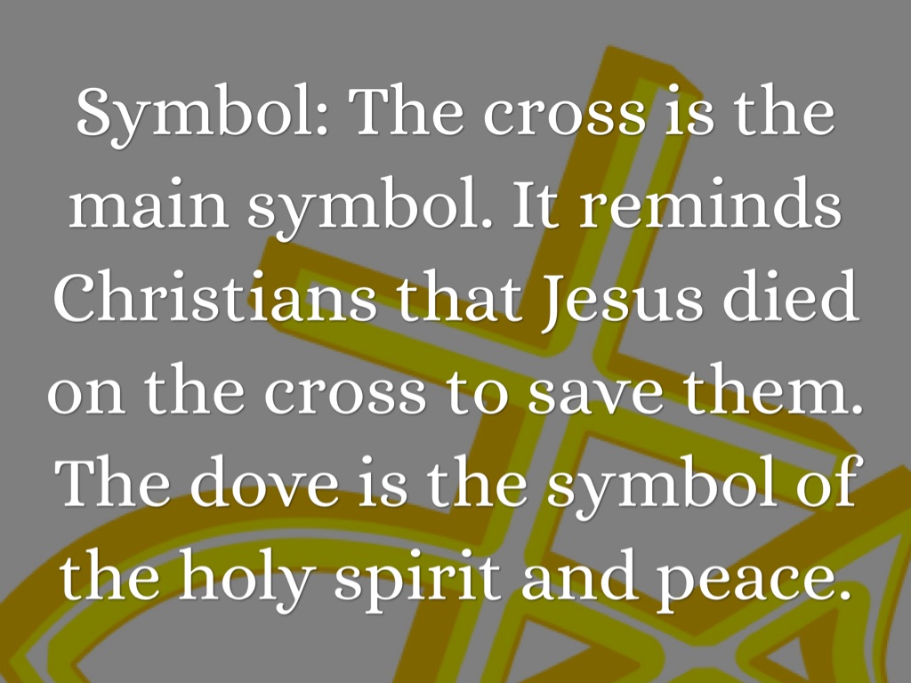 Symbol: The cross is the main symbol. It reminds Christians that Jesus died on the cross to save them. The dove is the symbol of the holy spirit and peace.