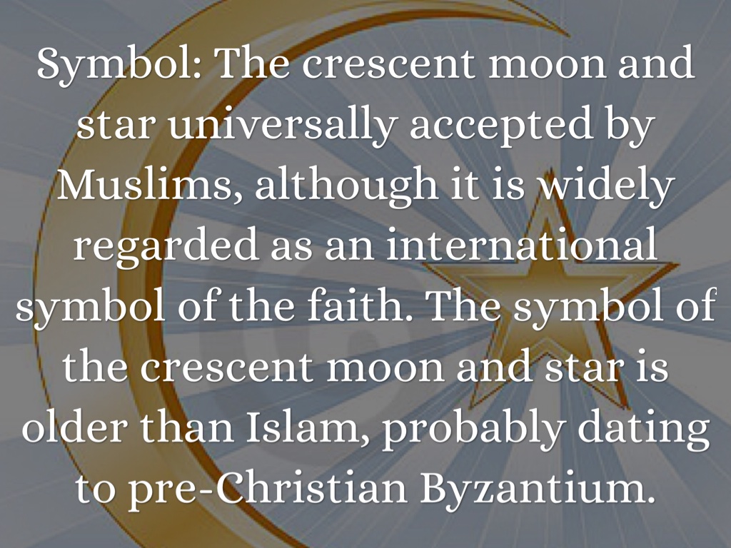 Symbol: The crescent moon and star universally accepted by Muslims, although it is widely regarded as an international symbol of the faith. The symbol of the crescent moon and star is older than Islam, probably dating to pre-Christian Byzantium.