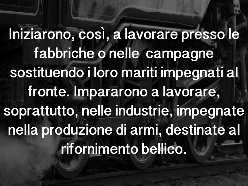 Iniziarono, così, a lavorare presso le fabbriche o nelle campagne sostituendo i loro mariti impegnati al fronte. Impararono a lavorare, soprattutto, nelle industrie, impegnate nella produzione di armi, destinate al rifornimento bellico.