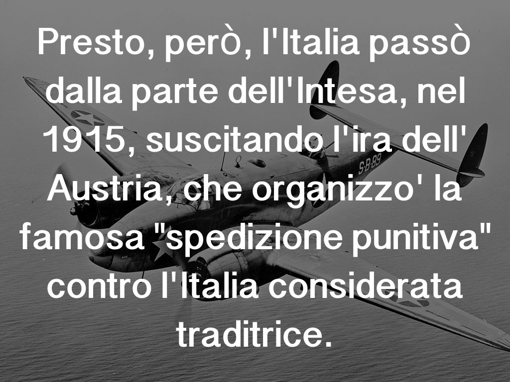 Presto, però, l'Italia passò dalla parte dell'Intesa, nel 1915, suscitando l'ira dell' Austria, che organizzo' la famosa "spedizione punitiva" contro l'Italia considerata traditrice.