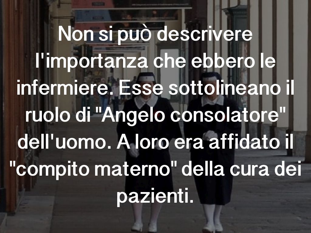 Non si può descrivere l'importanza che ebbero le infermiere. Esse sottolineano il ruolo di "Angelo consolatore" dell'uomo. A loro era affidato il "compito materno" della cura dei pazienti.