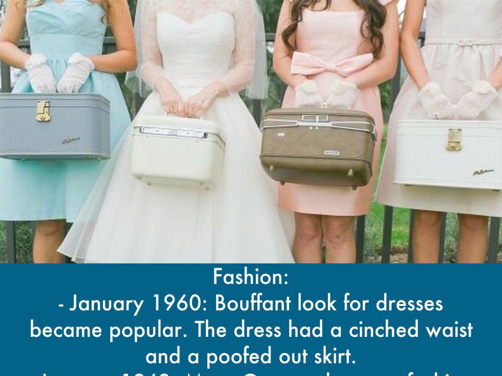 - January 1960: Bouffant look for dresses became popular. The dress had a cinched waist and a poofed out skirt.