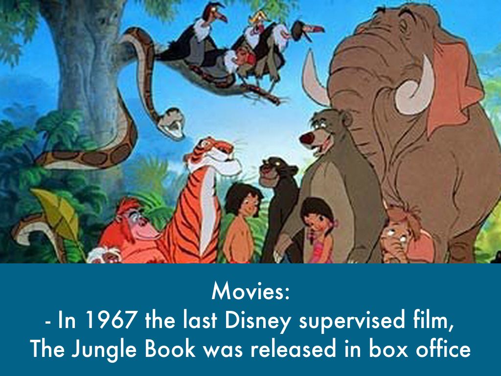 - In 1967 the last Disney supervised film, The Jungle Book was released in box office