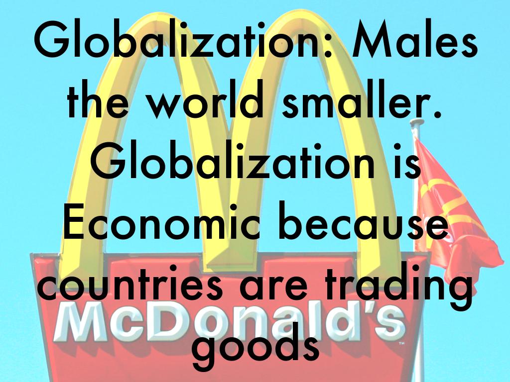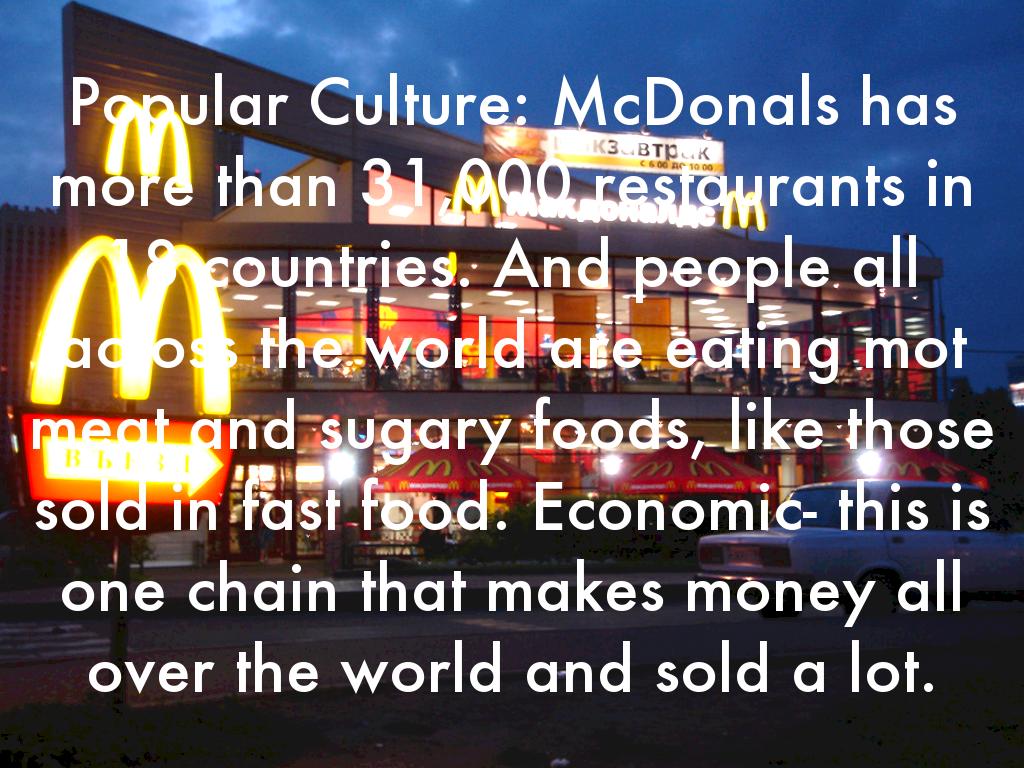 Popular Culture: McDonals has more than 31,000 restaurants in 18 countries. And people all across the world are eating mot meat and sugary foods, like those sold in fast food. Economic- this is one chain that makes money all over the world and sold a lot.