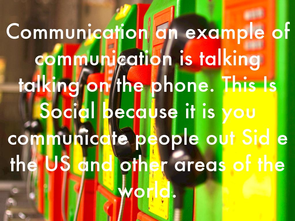 Communication an example of communication is talking talking on the phone. This Is Social because it is you communicate people out Sid e the US and other areas of the world.