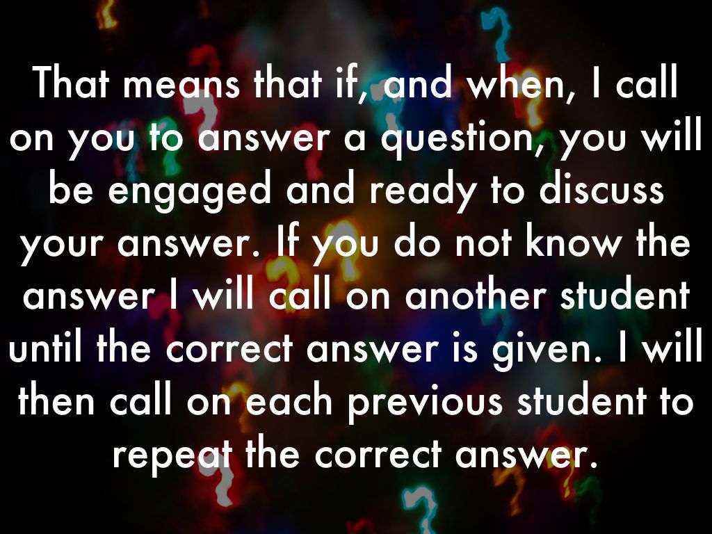 That means that if, and when, I call on you to answer a question, you will be engaged and ready to discuss your answer. If you do not know the answer I will call on another student until the correct answer is given. I will then call on each previous student to repeat the correct answer.