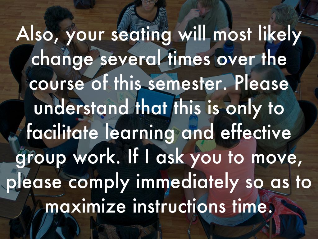 Also, your seating will most likely change several times over the course of this semester. Please understand that this is only to facilitate learning and effective group work. If I ask you to move, please comply immediately so as to maximize instructions time.
