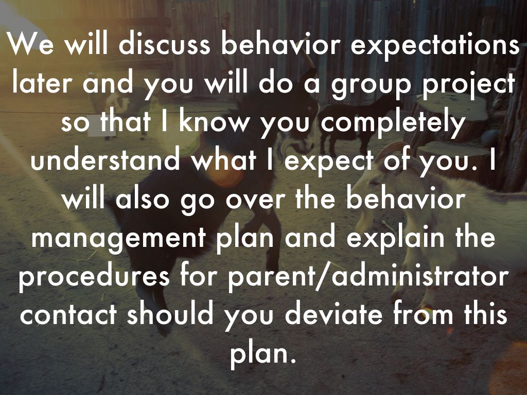 We will discuss behavior expectations later and you will do a group project so that I know you completely understand what I expect of you. I will also go over the behavior management plan and explain the procedures for parent/administrator contact should you deviate from this plan.