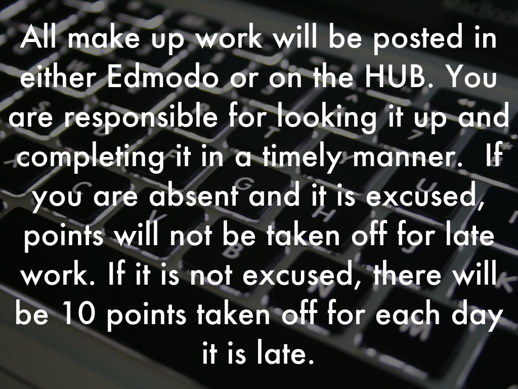 All make up work will be posted in either Edmodo or on the HUB. You are responsible for looking it up and completing it in a timely manner. If you are absent and it is excused, points will not be taken off for late work. If it is not excused, there will be 10 points taken off for each day it is late.