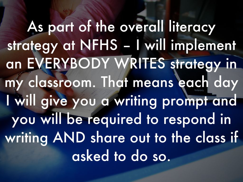As part of the overall literacy strategy at NFHS – I will implement an EVERYBODY WRITES strategy in my classroom. That means each day I will give you a writing prompt and you will be required to respond in writing AND share out to the class if asked to do so.