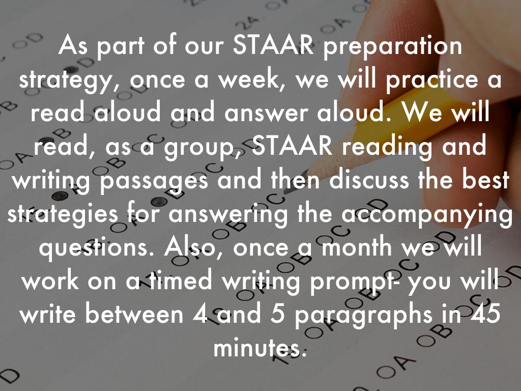 As part of our STAAR preparation strategy, once a week, we will practice a read aloud and answer aloud. We will read, as a group, STAAR reading and writing passages and then discuss the best strategies for answering the accompanying questions. Also, once a month we will work on a timed writing prompt- you will write between 4 and 5 paragraphs in 45 minutes.