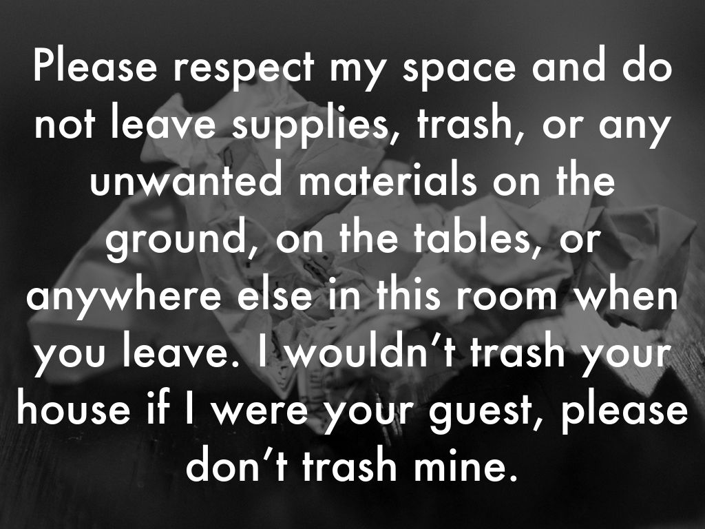 Please respect my space and do not leave supplies, trash, or any unwanted materials on the ground, on the tables, or anywhere else in this room when you leave. I wouldn’t trash your house if I were your guest, please don’t trash mine.