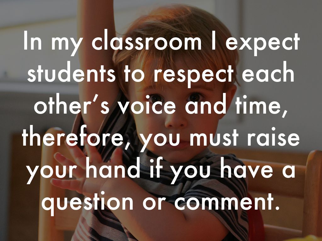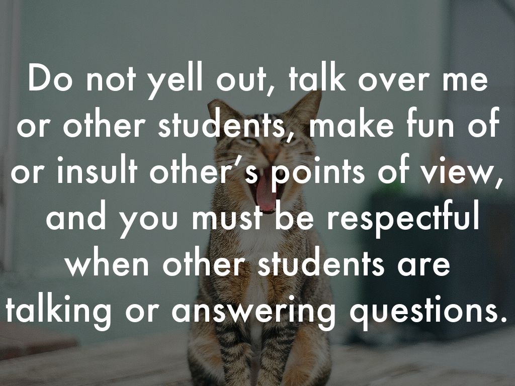 Do not yell out, talk over me or other students, make fun of or insult other’s points of view, and you must be respectful when other students are talking or answering questions.