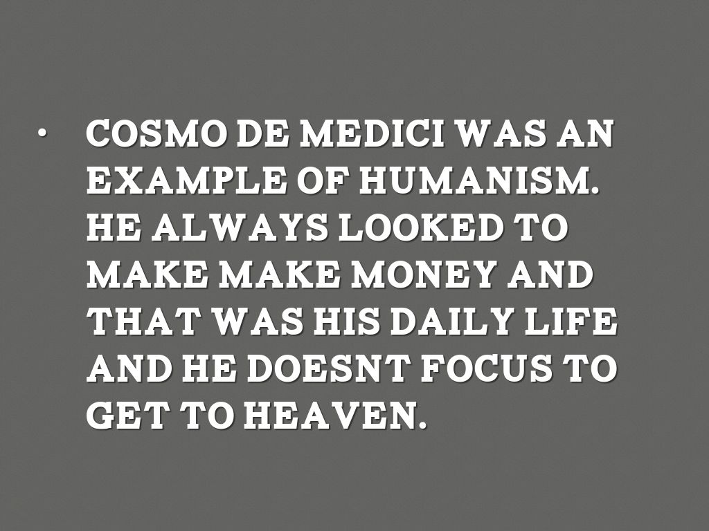 - Cosmo de medici was an example of humanism. He always looked to make make money and that was his daily life and he doesnt focus to get to heaven.