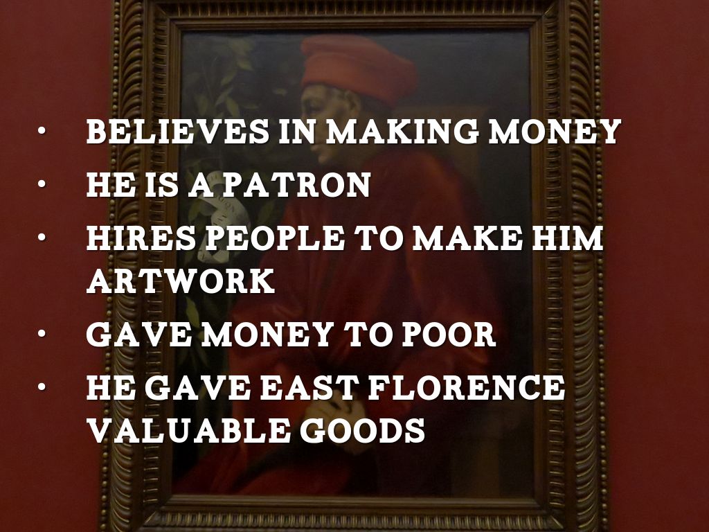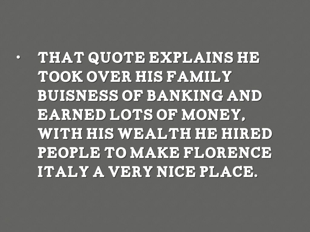 - That quote explains he took over his family buisness of banking and earned lots of money, with his wealth he hired people to make Florence Italy a very nice place.
