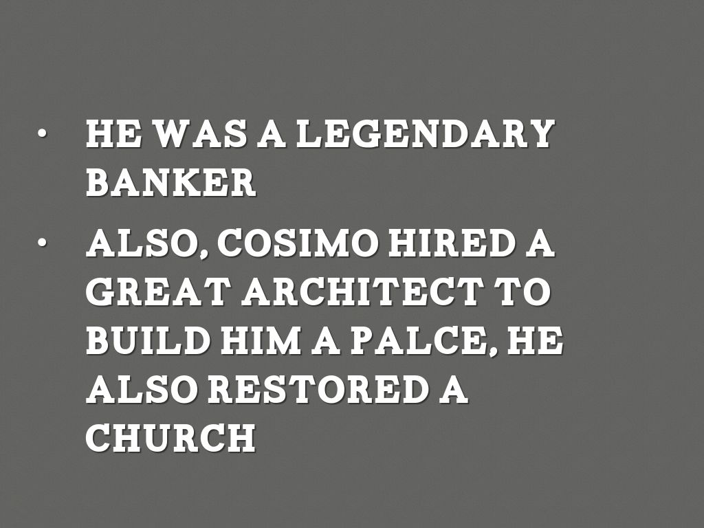 - Also, cosimo hired a great architect to build him a palce, he also restored a church