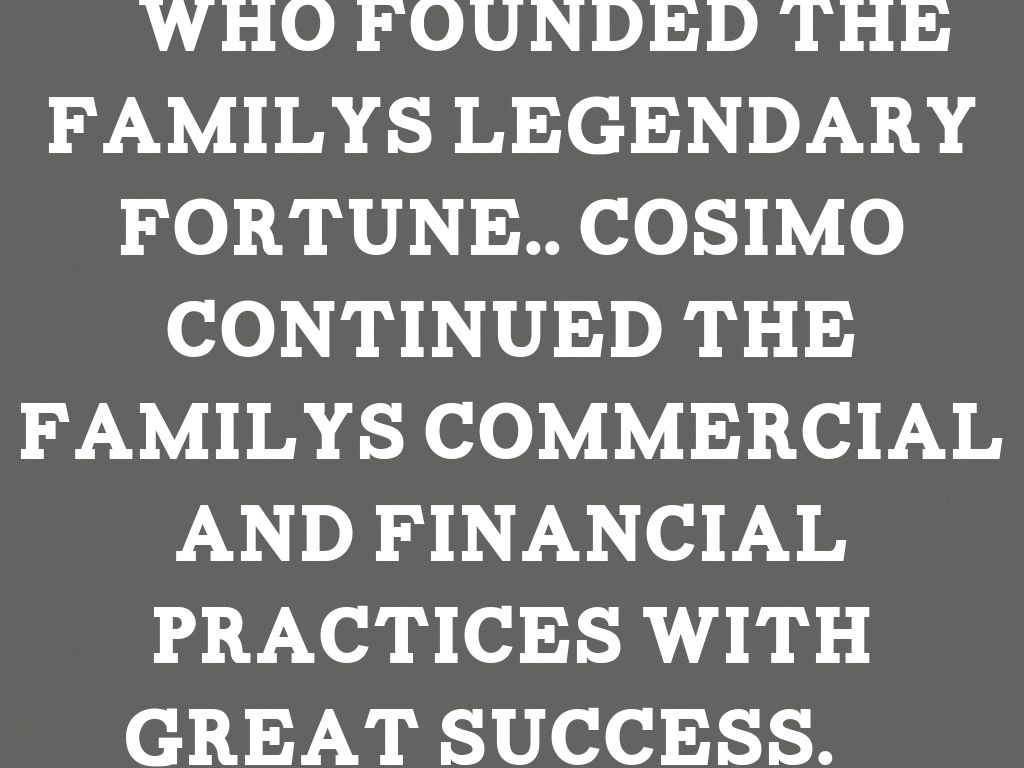 "Who founded the familys legendary fortune.. Cosimo continued the familys commercial and financial practices with great success."