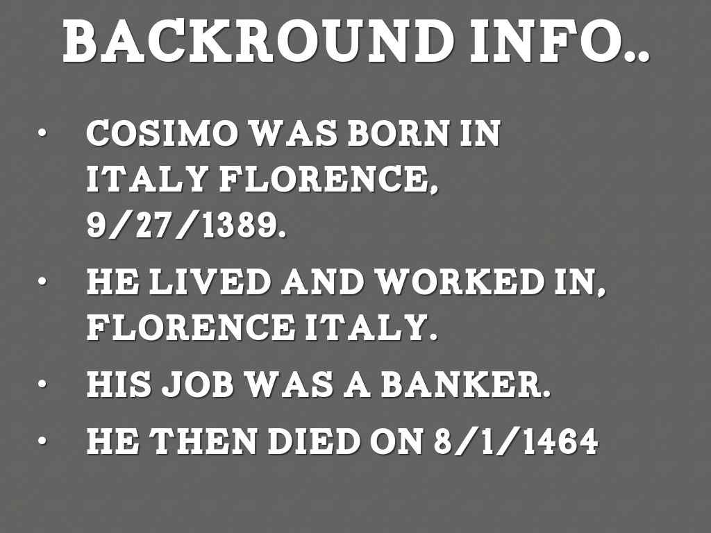 - Cosimo was born in Italy Florence, 9/27/1389.