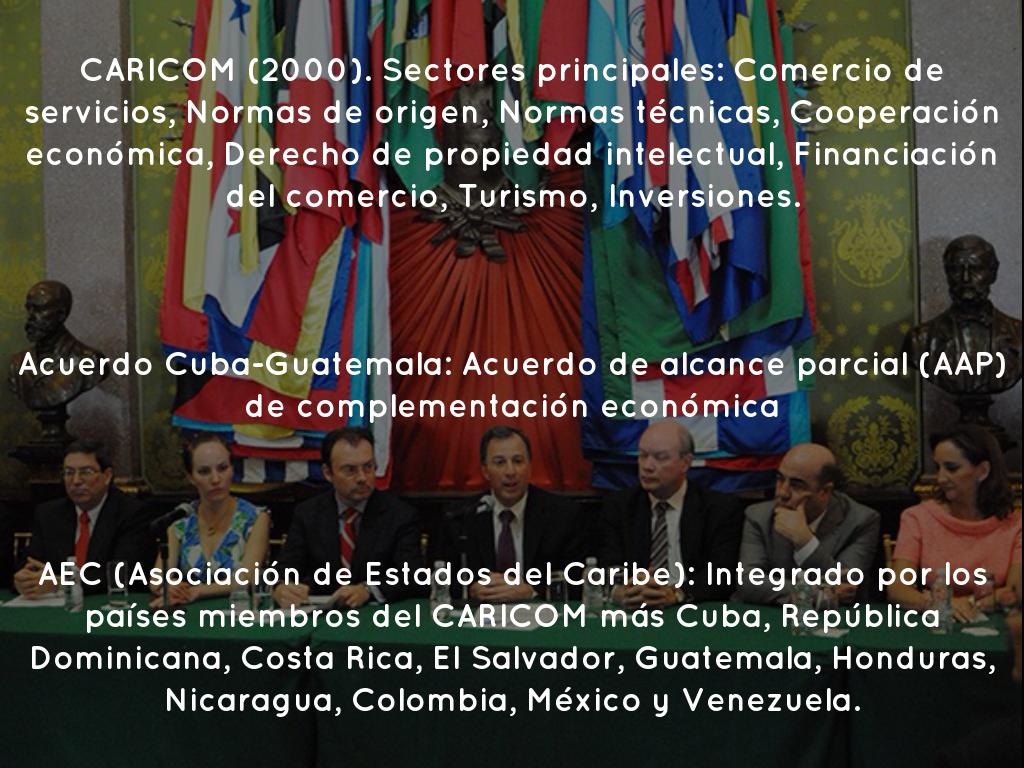AEC (Asociación de Estados del Caribe): Integrado por los países miembros del CARICOM más Cuba, República Dominicana, Costa Rica, El Salvador, Guatemala, Honduras, Nicaragua, Colombia, México y Venezuela.