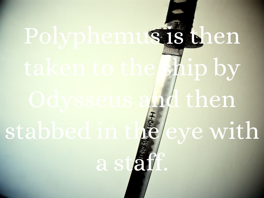 Polyphemus is then taken to the ship by Odysseus and then stabbed in the eye with a staff.