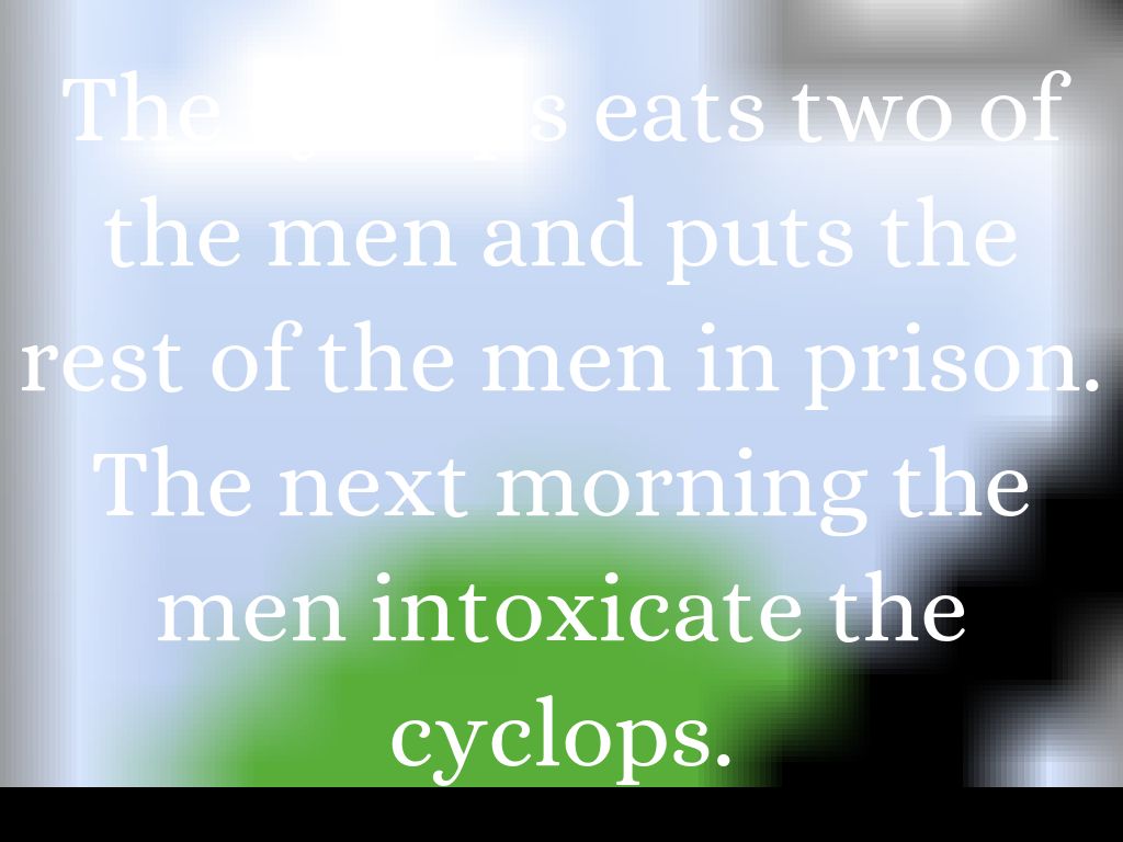 The cyclops eats two of the men and puts the rest of the men in prison. The next morning the men intoxicate the cyclops.
