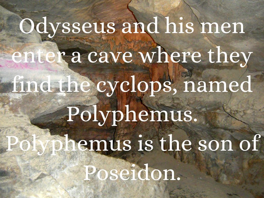 Odysseus and his men enter a cave where they find the cyclops, named Polyphemus. Polyphemus is the son of Poseidon.