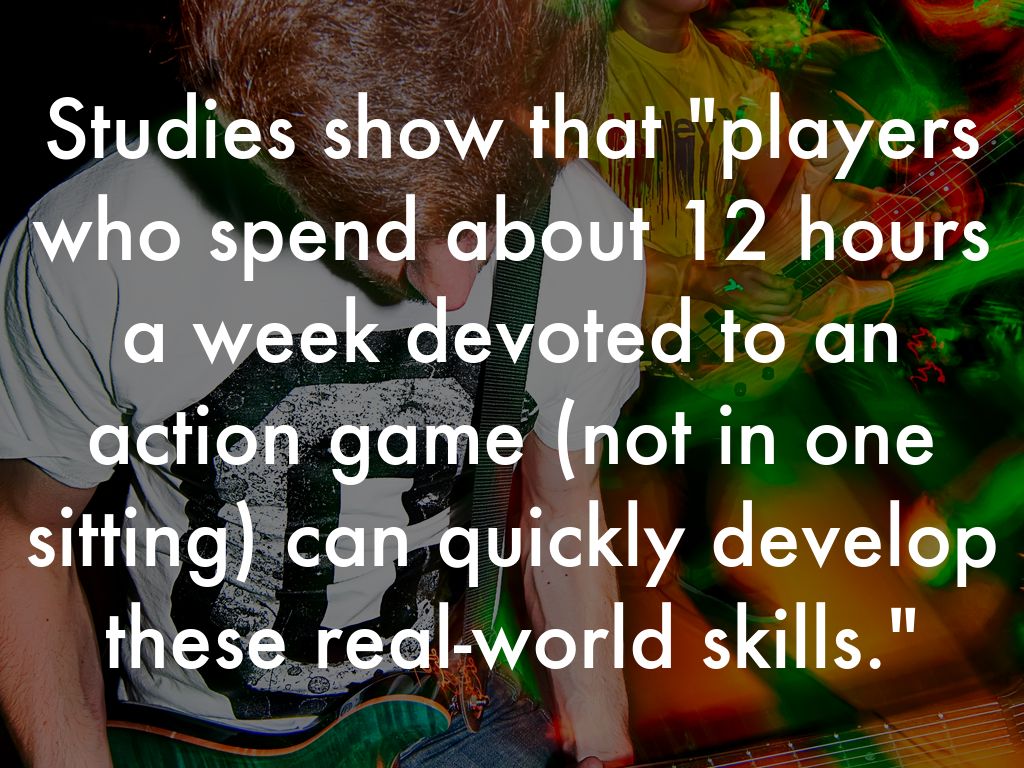 Studies show that "players who spend about 12 hours a week devoted to an action game (not in one sitting) can quickly develop these real-world skills."