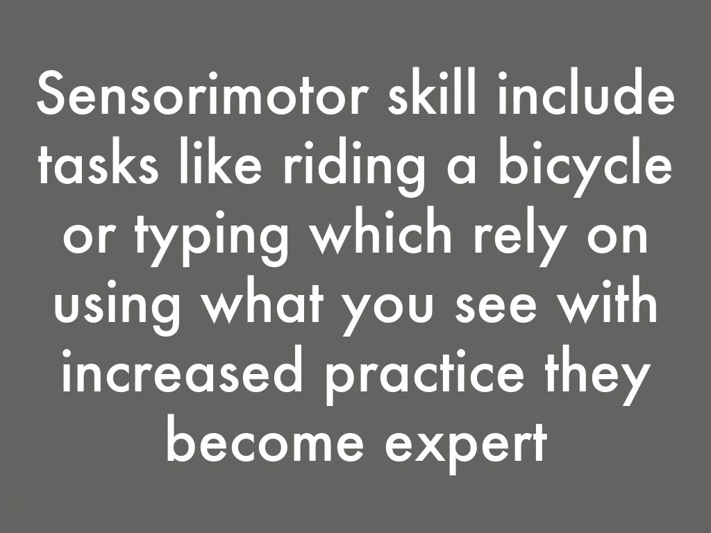 Sensorimotor skill include tasks like riding a bicycle or typing which rely on using what you see with increased practice they become expert