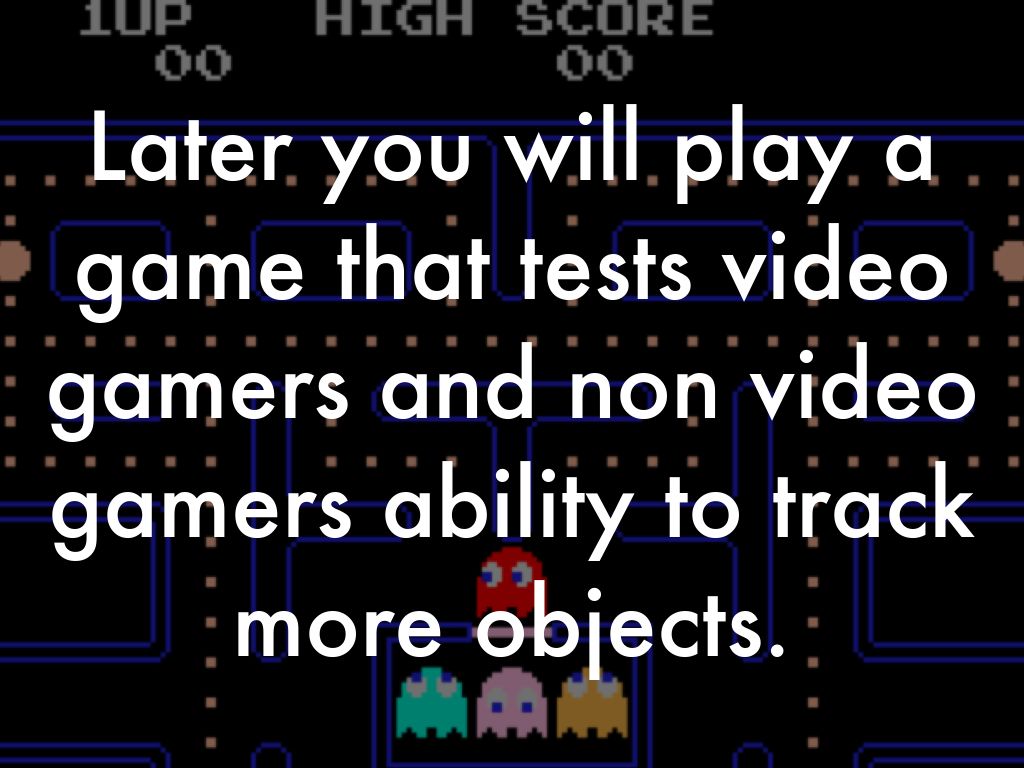 Later you will play a game that tests video gamers and non video gamers ability to track more objects.