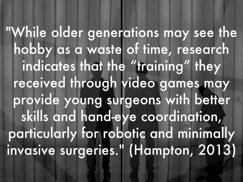 "While older generations may see the hobby as a waste of time, research indicates that the “training” they received through video games may provide young surgeons with better skills and hand-eye coordination, particularly for robotic and minimally invasive surgeries." (Hampton, 2013)