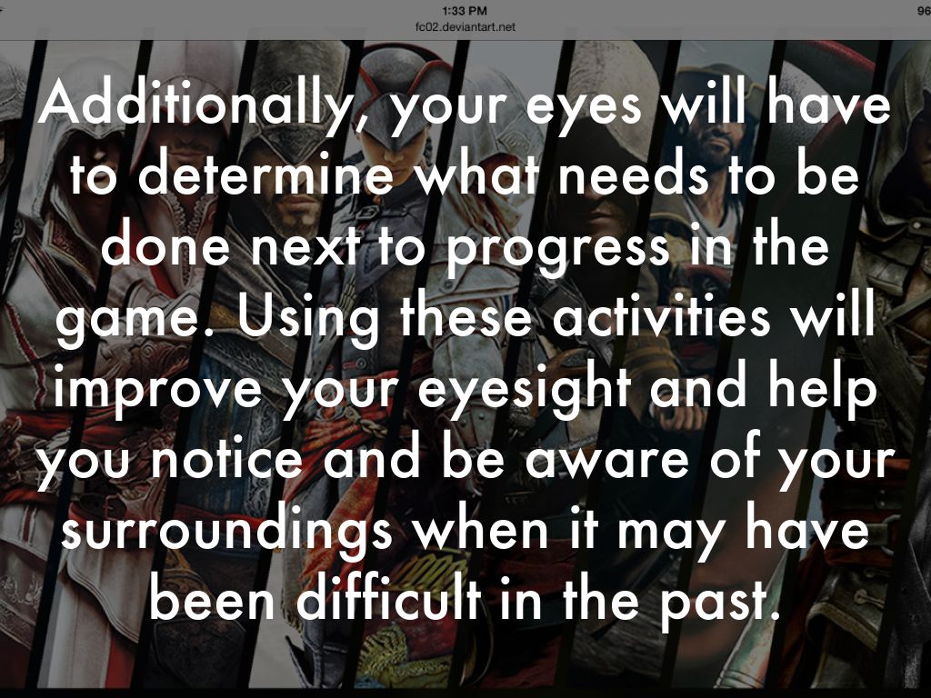 Additionally, your eyes will have to determine what needs to be done next to progress in the game. Using these activities will improve your eyesight and help you notice and be aware of your surroundings when it may have been difficult in the past.