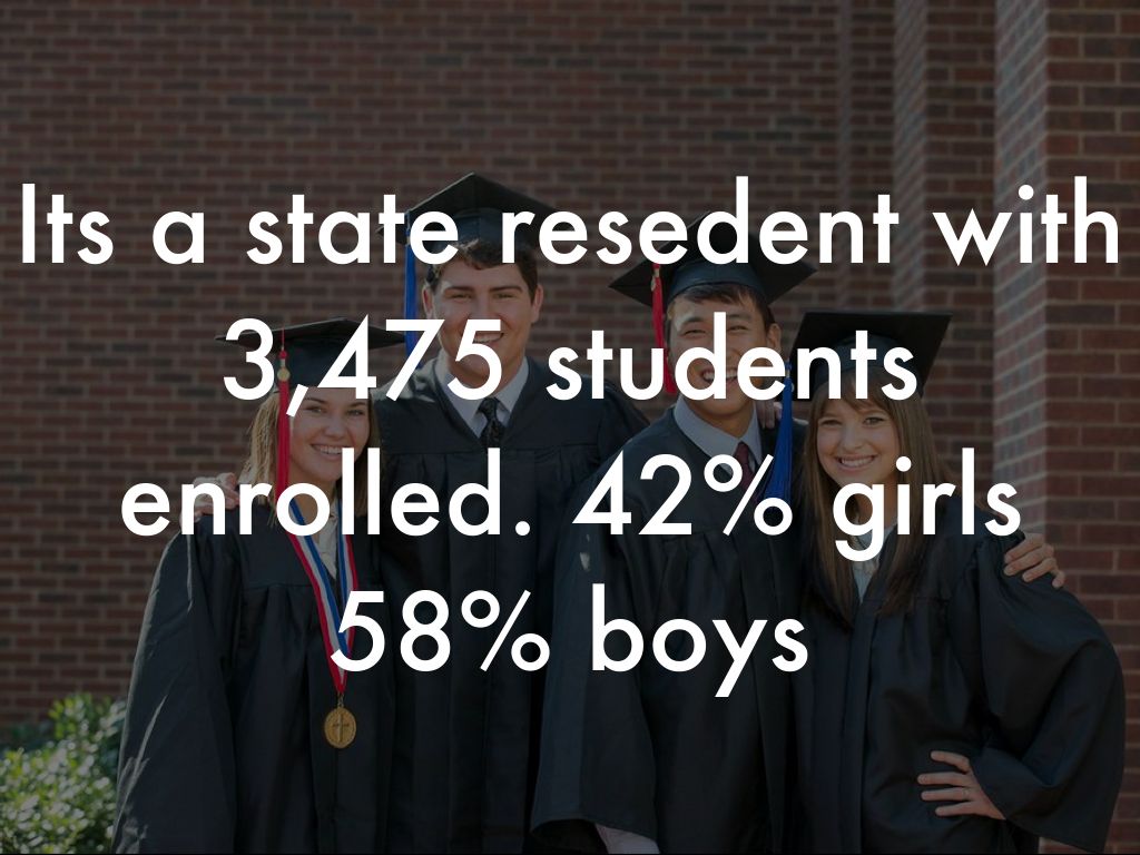 Its a state resedent with 3,475 students enrolled. 42% girls 58% boys