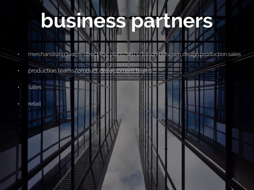 merchandising teams-direct line plans/sku's/liaison between design,production,sales