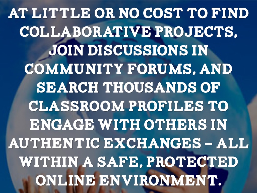 at little or no cost to find collaborative projects, join discussions in community forums, and search thousands of classroom profiles to engage with others in authentic exchanges - all within a safe, protected online environment.