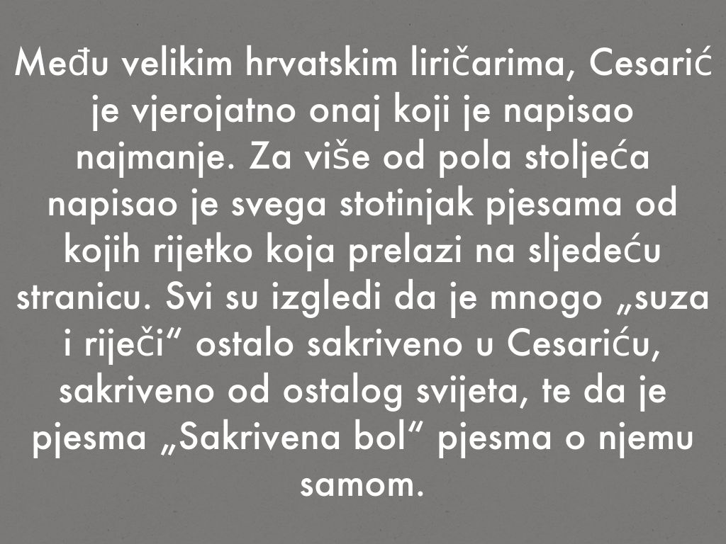 Među velikim hrvatskim liričarima, Cesarić je vjerojatno onaj koji je napisao najmanje. Za više od pola stoljeća napisao je svega stotinjak pjesama od kojih rijetko koja prelazi na sljedeću stranicu. Svi su izgledi da je mnogo „suza i riječi“ ostalo sakriveno u Cesariću, sakriveno od ostalog svijeta, te da je pjesma „Sakrivena bol“ pjesma o njemu samom.