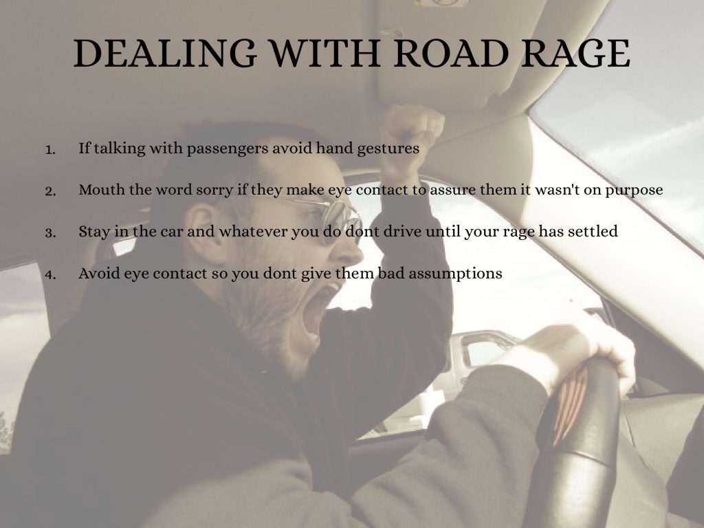 • Stay in the car and whatever you do dont drive until your rage has settled
