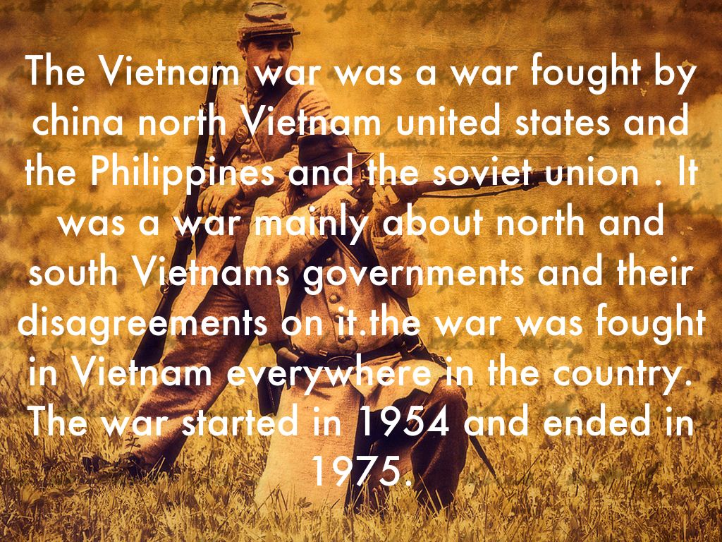The Vietnam war was a war fought by china north Vietnam united states and the Philippines and the soviet union . It was a war mainly about north and south Vietnams governments and their disagreements on it.the war was fought in Vietnam everywhere in the country. The war started in 1954 and ended in 1975.