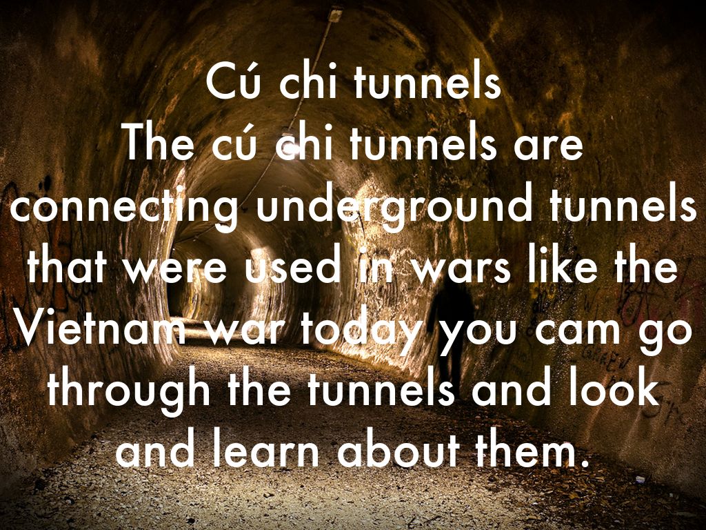 Cú chi tunnels The cú chi tunnels are connecting underground tunnels that were used in wars like the Vietnam war today you cam go through the tunnels and look and learn about them.