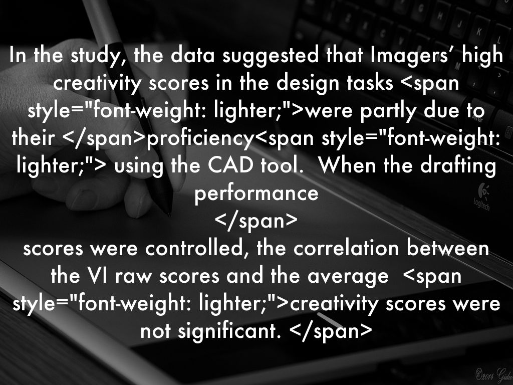 In the study, the data suggested that Imagers’ high creativity scores in the design tasks were partly due to their proficiency using the CAD tool. When the drafting performance