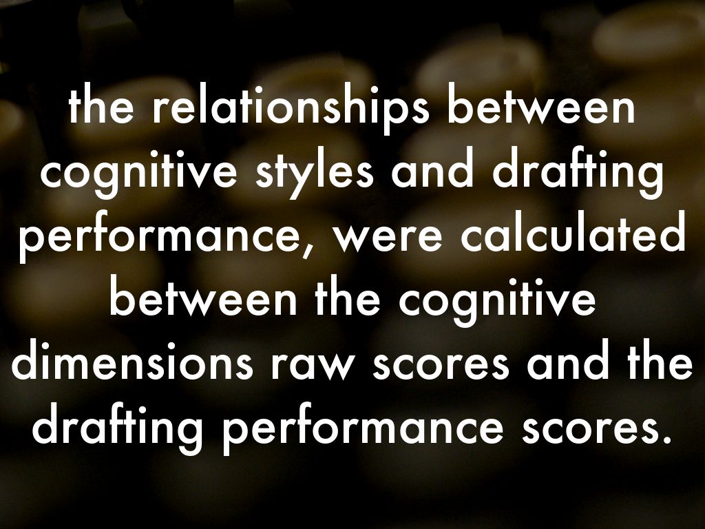 the relationships between cognitive styles and drafting performance, were calculated between the cognitive dimensions raw scores and the drafting performance scores.