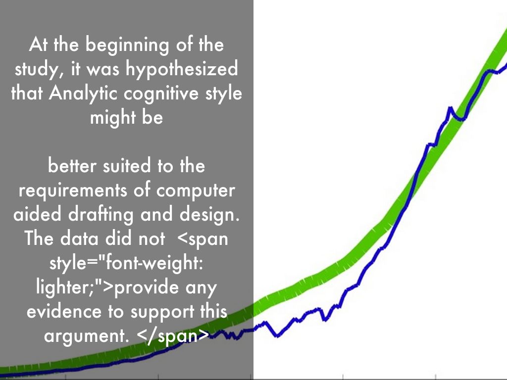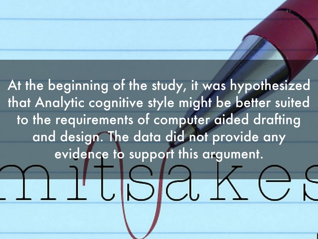 At the beginning of the study, it was hypothesized that Analytic cognitive style might be better suited to the requirements of computer aided drafting and design. The data did not provide any evidence to support this argument.