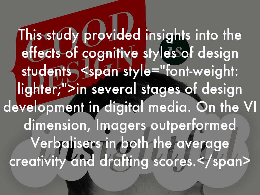 This study provided insights into the effects of cognitive styles of design students in several stages of design development in digital media. On the VI dimension, Imagers outperformed Verbalisers in both the average creativity and drafting scores.