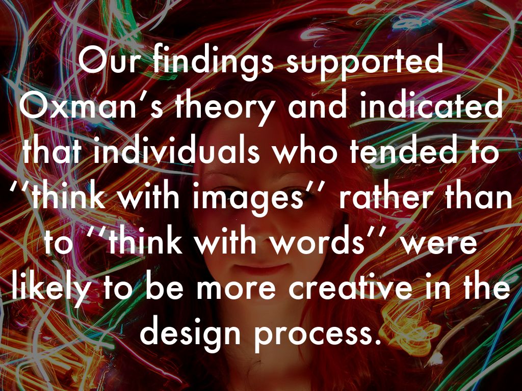 Our findings supported Oxman’s theory and indicated that individuals who tended to ‘‘think with images’’ rather than to ‘‘think with words’’ were likely to be more creative in the design process.