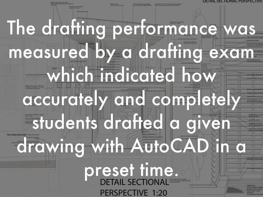 The drafting performance was measured by a drafting exam which indicated how accurately and completely students drafted a given drawing with AutoCAD in a preset time.
