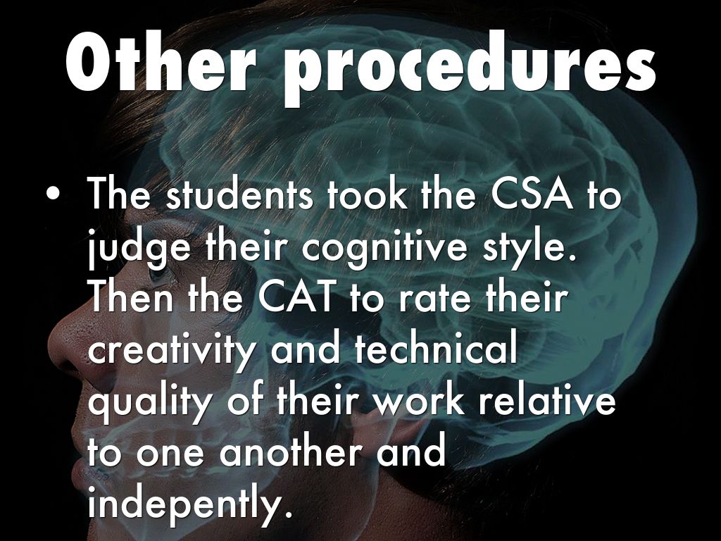 • The students took the CSA to judge their cognitive style. Then the CAT to rate their creativity and technical quality of their work relative to one another and indepently.